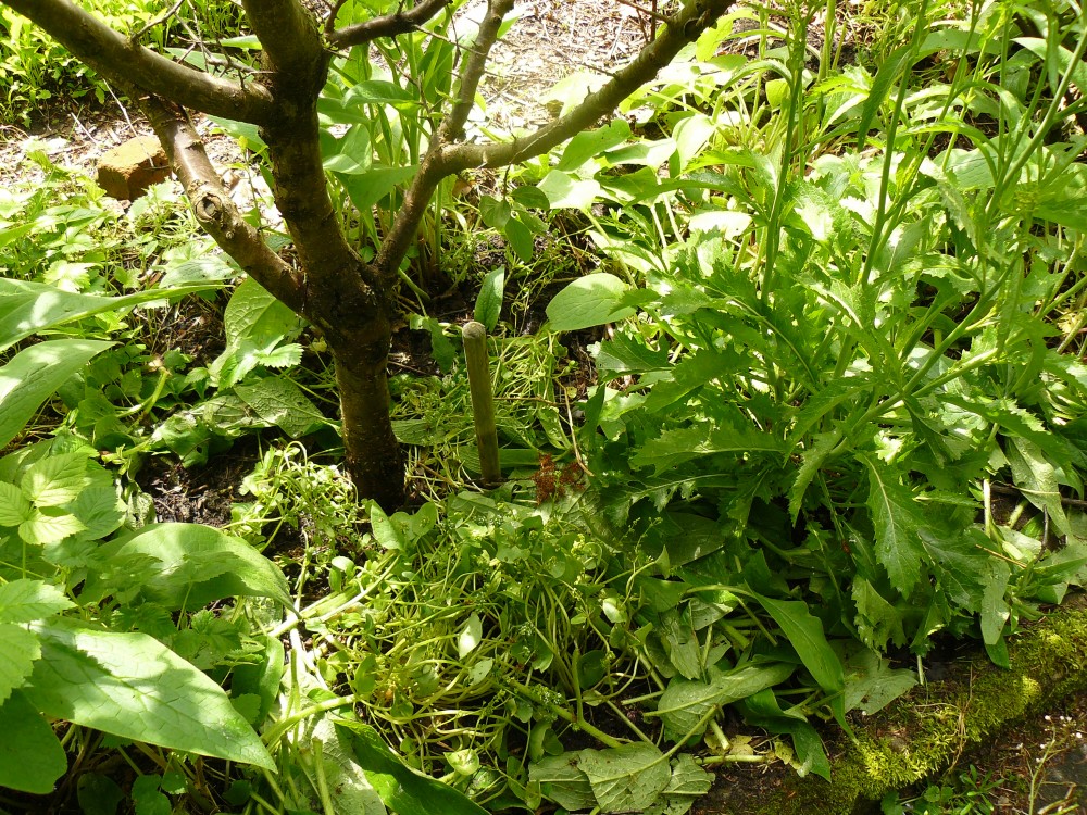 Versuch: Feldsalat Winterpostelein und Asiasalat als essbare zweijährige wurden in das inzwischen vergangene Scharbockskraut bzw. zwischen die Brutknöllchen gesetzt